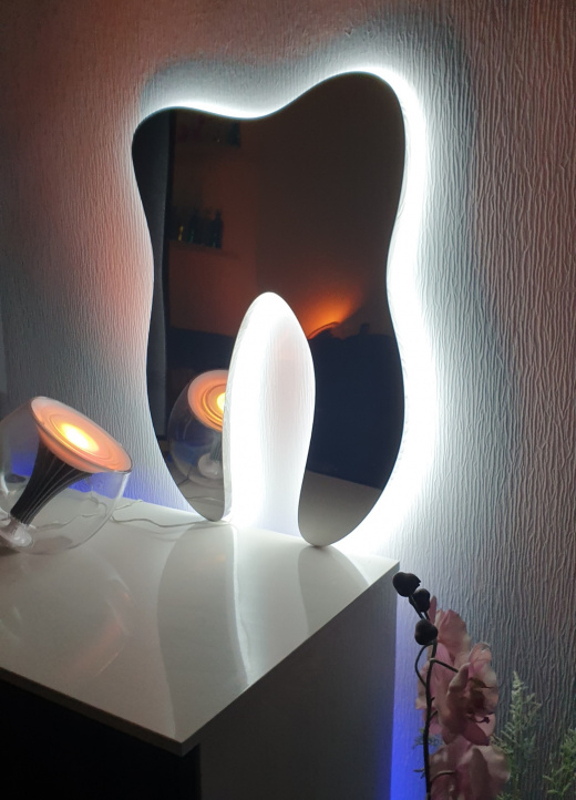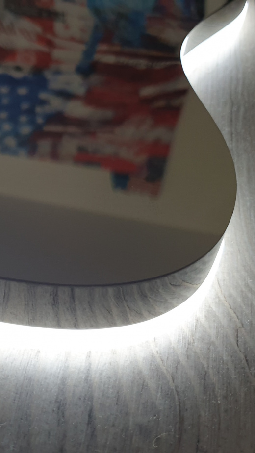 Metallische Oberfläche, hochglanz Chrom. Größe 41 x 29 x 3,5 cm (Höhe x Breite x Tiefe).Mit LED Hintergrundbeleuchtung, Dimmer. Bohrschablone und Befestigungsmaterial liegt bei.