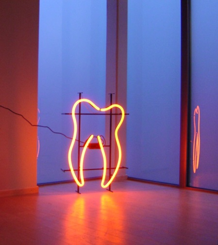 Der XXL-Zahn ist ca 80cm hoch und aus 12mm starkem Neonglas gefertigt. Mit dem Leichtmetallrahmen steht er von selbst oder kann an einem Wand- oder Deckenhaken aufgehängt werden. Siehe dazu auch die FAQ.